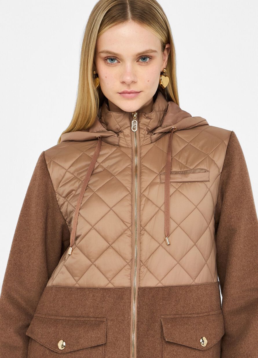 Parka marrone Realizzato in panno di misto lana Dettaglio in nylon trapuntato e imbottito Collo alto Cappuccio con coulisse Taschino sul petto Tasche con patta e bottone a pressione Tirazip logata Chiusura con zip